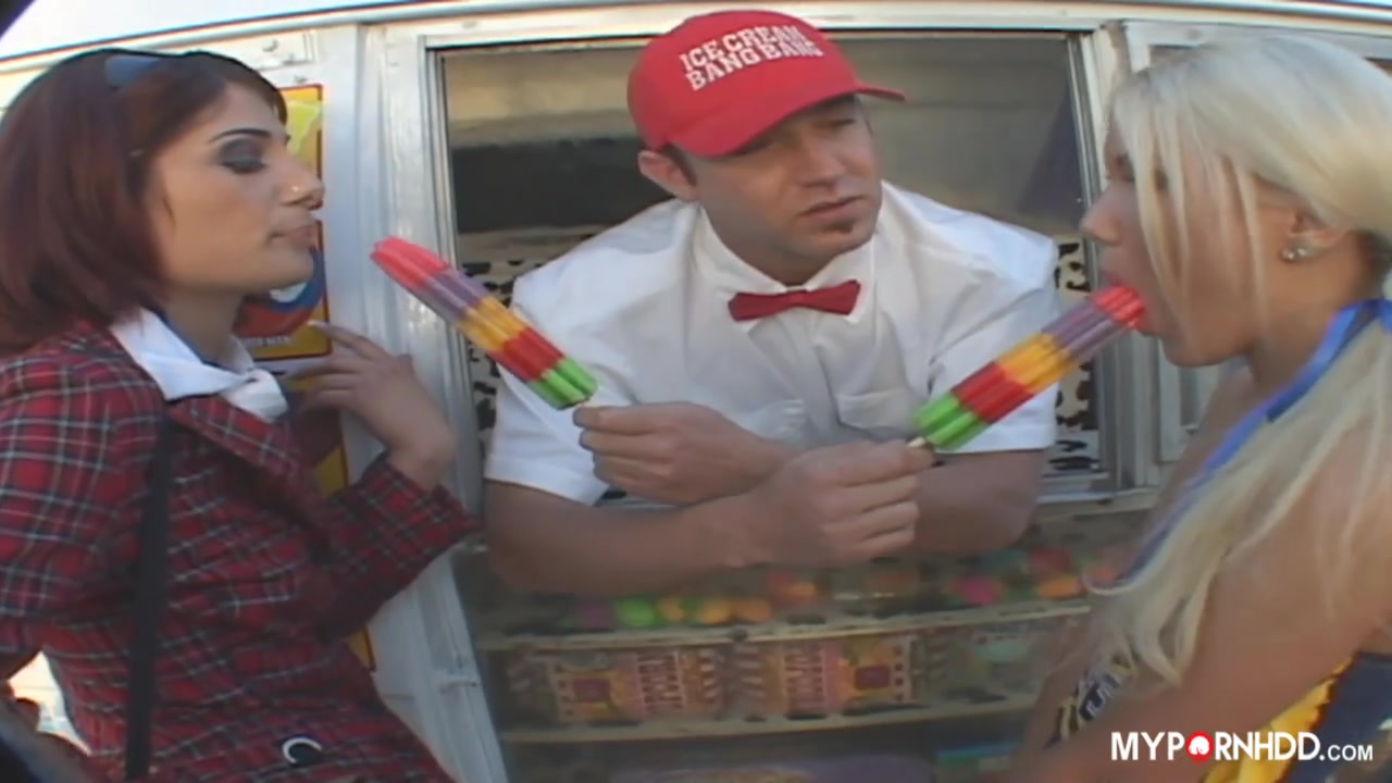 Hot schoolgirls Aubrey Adams and Dahlia Denyle love to eat ice-cream and suck hard dick